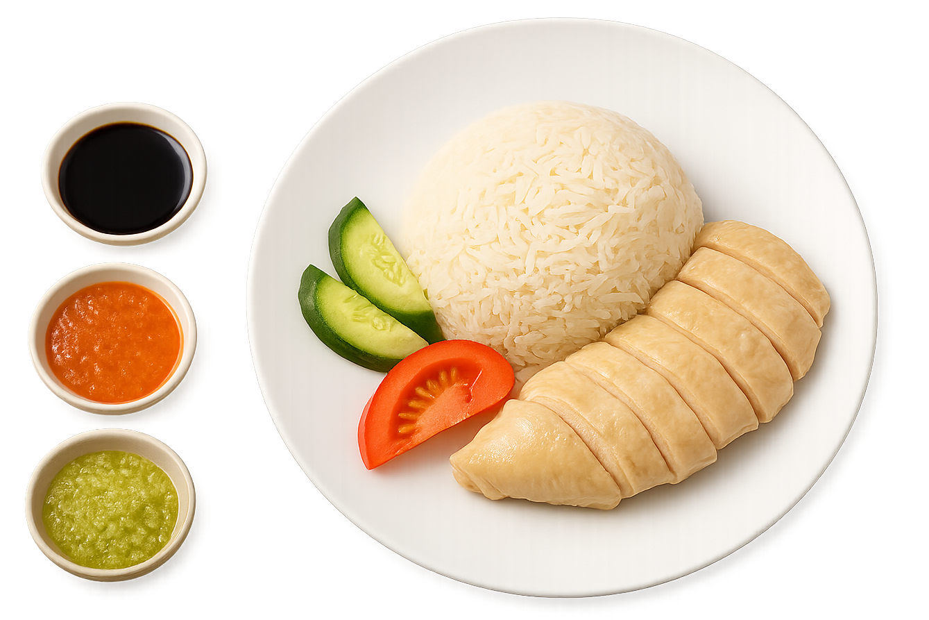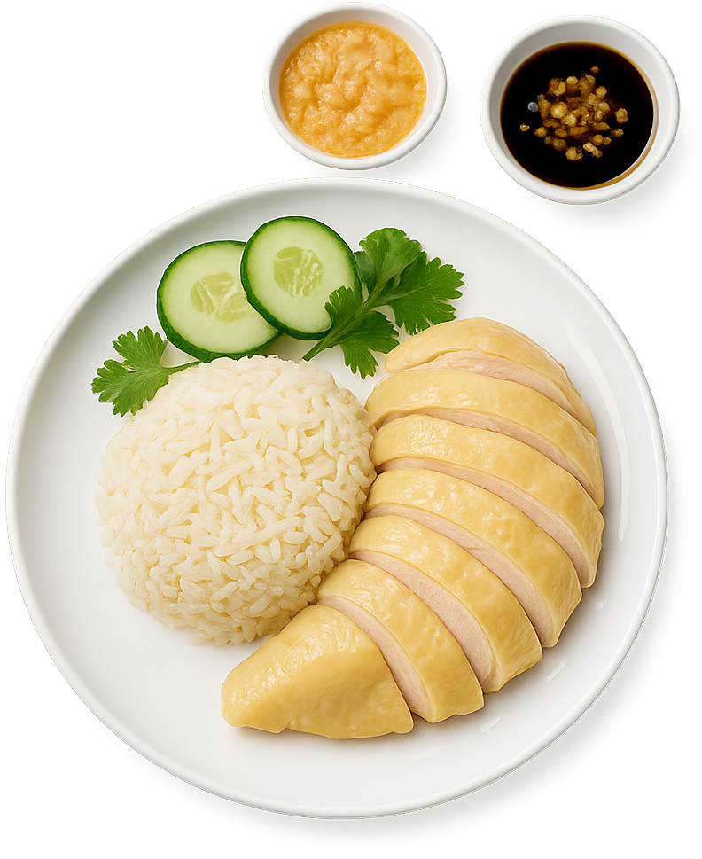 Tender poached chicken, juicy and flavorful, pairs perfectly with fragrant rice cooked in rich chicken broth. Accompanied by three iconic sauces—fiery chili, refreshing ginger, and savory soy—it delivers a harmony of taste that lingers.